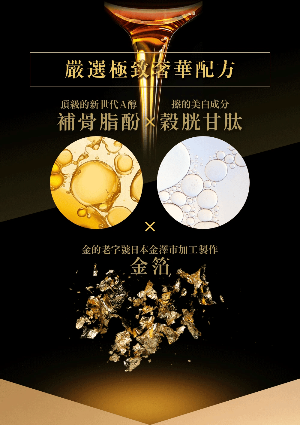 水、BG、甘油、乙醇、甲基葡糖醇聚醚-10、酵母菌/大米發酵產物濾液、1,3-丙二醇、卡波姆、(聚乙二醇-240/癸基十四烷基醚-20/HDI)共聚物、丙烯酸(酯)類/C10-30 烷醇丙烯酸酯交聯聚合物、羥乙基纖維素、PPG-6-癸基十四醇聚醚-20、氫氧化鈉、黃金、偏磷酸鈉、補骨脂酚、穀胱甘肽、苯氧乙醇、月桂酸鉀、生育酚、二丁基羥基甲苯